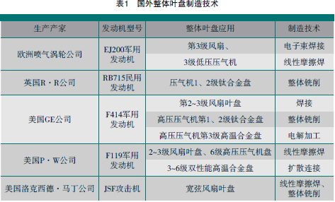 目前国外整体叶盘制造技术主要有:焊接工艺技术、铣削加工技术、精锻制造技术、电解加工技术等,采用的工艺流程为:精密锻造+数控加工;精密焊接+数控加工;高温合金精铸毛坯+热等静压处理。其制造工艺技术的主要应用如表1所示[1]。美、英、俄等发达国家在整体叶盘制造领域处于领先地位,且其具有先进的铣削装备、焊接工艺装备等。
