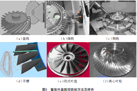 国内西北工业大学于1991年起对整体叶盘制造技术进行研究,突破多项关键技术,开发了“叶轮类零件多坐标NC 编程专用软件系统”,该系统集测量数据预处理、曲面建模、曲面消隐、刀位计算、刀位验证及后置处理于一体,经过多年的分析研究,完成了整体叶盘数字化精密制造技术关键工艺,采用侧铣与插铣复合高效铣加工,完成叶盘的粗精加工,进行刀位点计算及加工轨迹优化,直纹面拟合等多项技术创新,此外,其自主研发高效盘铣- 插铣复合铣削中心,对提高整体叶盘铣削效率有着重大意义[2,17-19],其主要铣削加工方法及加工样件如图5所示。