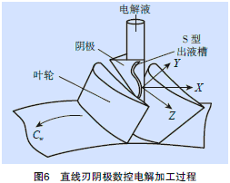 国内对整体叶盘数控电解加工技术的研究尚浅,南京航空航天大学从80年代中期开始对其进行研究,提出了“直线刃”阴极数控展成电解加工和成形或近成形阴极柔性电解加工方法,以简单的直线刃阴极进行数控展成运动,基于电化学阳极溶解原理而实现整体叶盘叶间槽与叶片型面的成形加工,如图6所示[23]。由于数控电解加工需采用多轴数控电解机床,对数控技术水平要求高,电解成形规律掌握较困难,目前正处于研究阶段,其有望解决数控铣削无法实现的整体叶盘加工。
