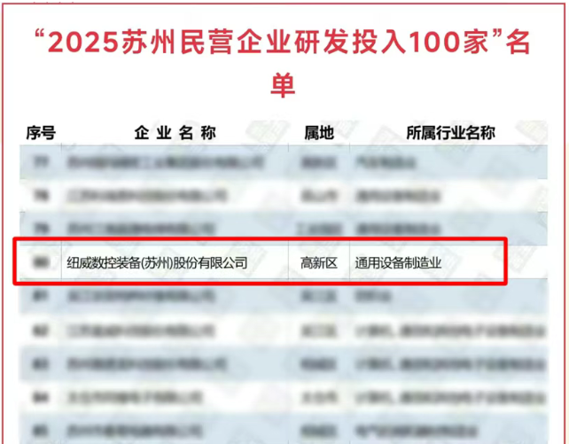 纽威数控成功入选“2025苏州民营企业研发投入100家”榜单
