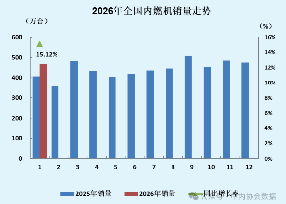 经过2026年1月政策的切换和调整,部分消费需求提前释放,消费者观望等待,一定程度影响了市场销量,但上年同期有效工作日少,并且在摩托车行业强势带动下,内燃机行业展现出强大的发展韧性和活力,内燃机市场开年良好运行。根据中国内燃机工业协会最新数据显示,1月内燃机销量467.61万台,环比增长-1.46%,同比增长15.02%。