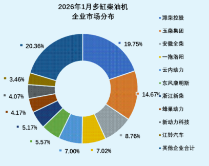 1月,多缸柴油机企业共计销量42.27万台,环比增长17.41%,同比增长24.90%。潍柴、玉柴、全柴、一拖、云内、东康、新柴、蜂巢动力、新动力科技、江铃销量居前十名,占多缸柴油机总销量的79.64%;市场份额占比中:潍柴19.75%、玉柴14.67%、全柴8.76%、一拖7.02%、云内7.00%、东康5.57%、新柴5.17%、蜂巢动力4.17%、新动力科技4.07%、江铃3.46%。