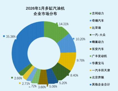 乘用车用在多缸汽油机占比为97.17%,1月销量146.60万台,环比增长-17.69%,同比增长-0.76%。吉利、奇瑞、比亚迪、一汽-大众、蜂巢动力、长安汽车、广丰发动机、华晨宝马、一汽丰田天津、北京奔驰销量排在前列。
