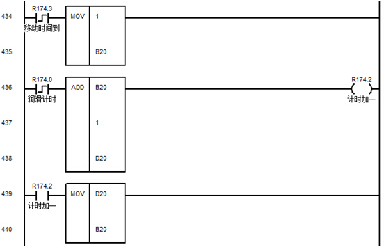 下一步,需要计算机床轴移动(R175.0)累加时间多少,因为当机床没有移动或进给保持,机床轴移动时间也为暂停,要分段计算,如图2所示,通过以轴移动信号条件采取加减运算,当R175.0导通时R174.0为计时每秒加1存储到寄存器B20,参数设定时间和B20相等时,启动润滑输出。