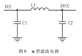 数据采集的精确度影响牵引力的跟踪精度,从而对整个伺服控制系统的精度和稳定性造成很大的影响。ATmega16 单片机的内部 ADC 采样精度可以达到 10 位,最大精度下可实现每秒 15 k SPS 的采样速率,可以满足伺服控制系统的要求。ADC 的工作电源由 AVCC 提供,AVCC 的稳定性影响 ADC 的转换精度,系统电源 VCC 通过 π 形滤波器接入 AT-mega16 的 AVCC 引脚,这样就能很好地抑制系统电源中的噪声,提高 AVCC 的稳定性。图 6 为 π 型滤波连线图。