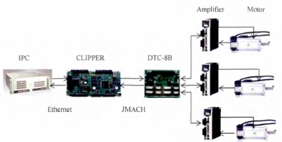 本文采用基于 PC + NC 的开放式数控系统设计理念,利用研华 610L 作为上位机实现控制任务,如运动轨迹生成、伺服轴状态监测、数控任务管理、人机交互界面的编写,使用泰道公司生产TurboPMAC Clipper 运动控制器作为下位机,实现伺服指令的产生、插补轨迹生成、PLC 顺序控制任务的实现,伺服系统采用松下 A5 系列伺服驱动器与伺服电机,数控系统硬件结构见图2。