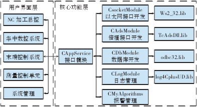 报警管理和日志管理模块作为日志和报警管理接口,主要用于软件、设备操作日志管理和系统故障报警信息管理。选用 C++ 开源日志库log4cplus 进行日志管理。log4cplus将日志信息和报警信息分别生成两份 Text 文件,并对这些信息进行编号和等级划分。同时重点开发通信控制模块,选用高效、稳定的通信方式和协议完成上位机集成控制系统与下位层HNC-8 数控系统、倍福 PLC 控制程序之间的数据交互,切实发挥上位机集成控制软件在加工控制系统中的主导作用。