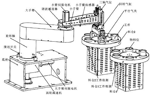 由一台平面关节机械手和两套物料料位组成。平面关节机械手包括分别由伺服电机经减速机 ( 减速比 1 ∶ 100) 驱动在水平方向旋转的 1 个大手臂、1 个小手臂,由气缸驱动手腕上下运动的 1 个移动关节和由旋转气缸驱动的 1 个手腕关节及两套气动手爪等;物料架各设有 6 个物料位,由直流电机驱动,料位上安装活动托盘形,以便于适应不同形状的零件,同时料位下方安装接触式传感器,用于判断是否放置物料,机械手自动送料机构的结构示意图见图 2。机械手将半成品物料位抓取半成品工件放置到加工中心上的气动夹具内,等待加工完成后,将加工后的成品工件抓取放置在成品料仓内。
