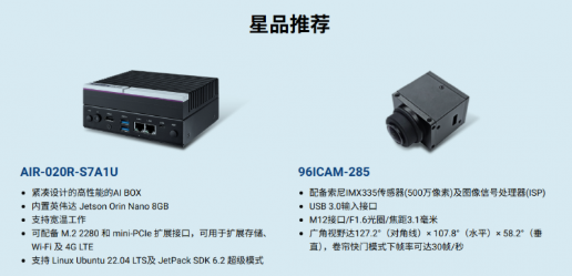 96ICAM-285相机则配备了500万像素IMX335传感器,拥有广角视野与卷帘快门,帧率达到30fps,能够为用户提供清晰、流畅的图像数据,进一步提升视觉AI应用的效果。