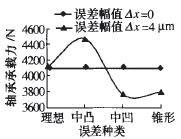 这里分析主轴圆柱度误差幅值缸(Ax=3“m,4斗m,5斗m,6斗m)、如图2中主轴圆柱度误差种类(中凹、中凸、锥形)对动静压轴承性能的影响。具体为:分析主轴圆柱度误差幅值血对动静压轴承性能的影响时,设定主轴圆柱度误差种类为中凸误差;分析主轴圆柱度误差种类对动静压轴承性能的影响时,主轴圆柱度误差幅值为一定值。