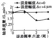 忽略主轴在轴向方向的误差变化,主轴圆度误差按频率.厂则可分为0(无误差)、1、波/周、2’波/周以及3波/周等四种情形旧1,分别对应.厂=0,1,2,3。影响动静压轴承|生能的因素较多,主要包括主轴转速、轴承供油压力和偏心率等。主要分析主轴圆度误差幅值缸(Ax=3岬,4岬,5 lxna,6斗m)与误差频率彤=0,1,2,3)对动静压轴承l生能的影响。具体为:分析误差幅值对轴承陛能的影响时,厂为一定值;分析误差频率.厂对轴承性能的影响时,血为一定值。