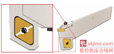 山特维克可乐满推出了全新的车削概念产品PrimeTurning,其车刀(图4)刀片槽的底部安排了凸起的筋条,刀片的底面压制出了相对应的凹槽,这相当于在刀片与刀片槽之间安排了几组定位键槽,可与刀片外形一起防止刀片的晃动。
