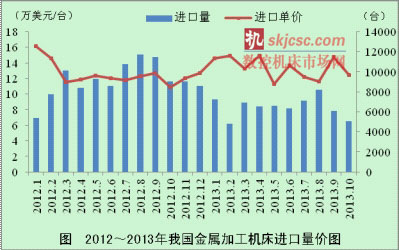 从2012年底开始,金属加工机床进口量连续减少,进口单价却居高不下,进入2013年这一趋势仍在持续,说明企业进口的主要是高端机床产品。前三季度进口量下降,单价却提高5.7%,但从8月开始进口量减少,进口单价在10月也开始回落。