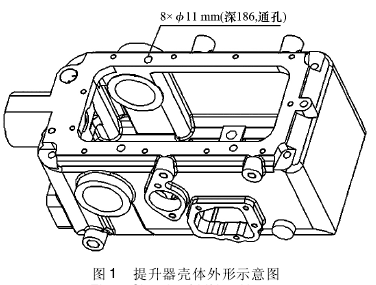本提升器壳体加工难点在于 8 个 11 贯穿深孔的加工,钻孔深度与钻头直径比值达到 17,加工难度较大。